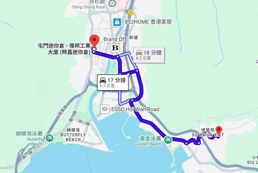 時昌迷你倉 位於屯門建榮里2號偉邦工業大廈,距離星堤僅約 4公里 路程,駕車約 8至10分鐘 即可到達。