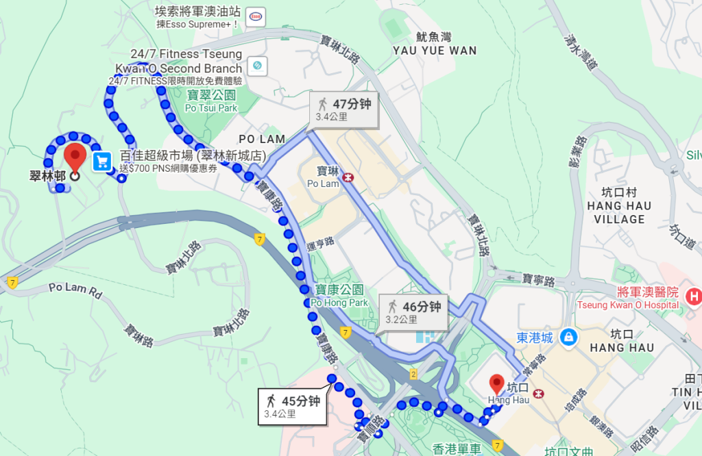 | 翠林邨 | 約45分鐘步程 | 沿常寧路直達安寧花園 |