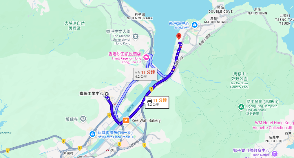 | 聽濤雅苑 | 私家車 / 的士 | 約 12-15 分鐘 | 經馬鞍山繞道直達,富騰中心上落貨區域寬闊。 |