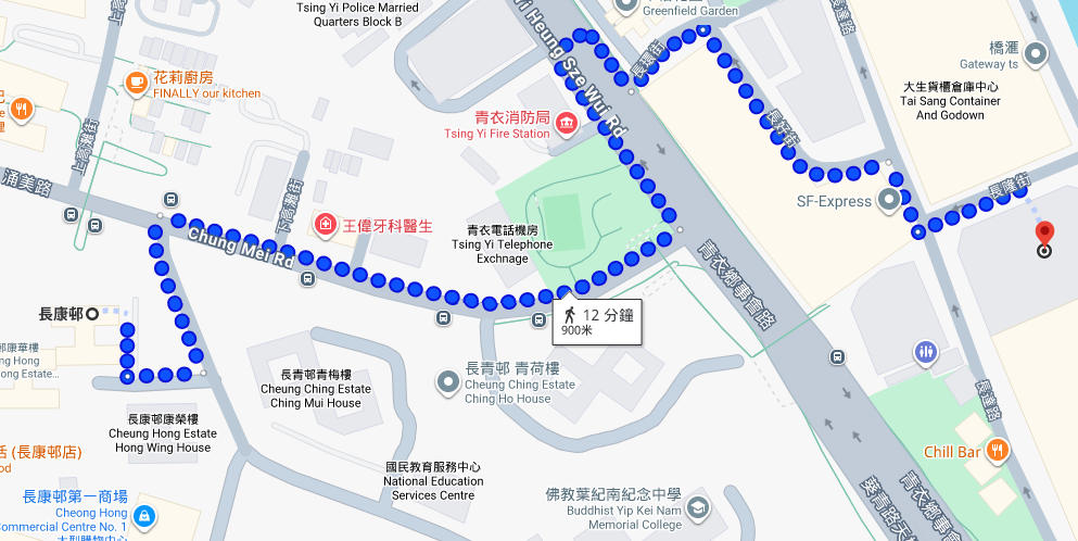 從長康邨出發,駛入長康路,然後轉入青衣長隆街,大約10-15分鐘車程即可到達青衣工業中心1期A座(我們的倉庫位置)。